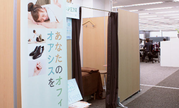 - 石川さん場所に加え10分間の無料体験イベントも実施しました。イントラで告知をしたり、チラシを各部署に配布したり。当日はOffisisの施術者の方に社内アナウンスでイベントを紹介していただき、楽しい雰囲気を盛り上げてもらいました。
